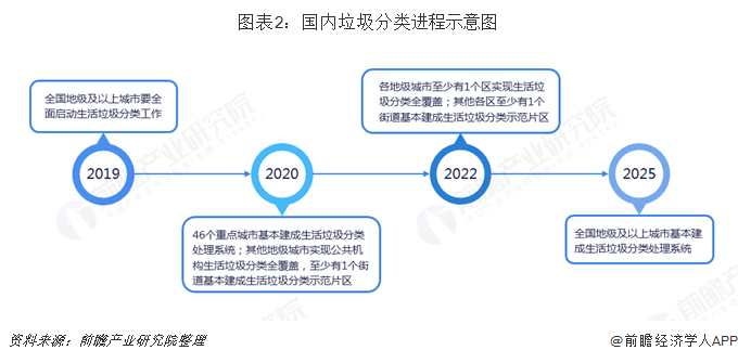 垃圾分類進程明顯加快:2019年6月,住建部發(fā)布《關于在全國地級及以上城市全面開展生活垃圾分類工作的通知》提出,2019年起,全國地級及以上城市要全面啟動生活垃圾分類工作;2020年底,全國46個重點城市要基本建成垃圾分類處理系統(tǒng);2022年前,各地級城市至少有1個區(qū)實現(xiàn)生活垃圾分類全覆蓋;2025年底前,全國地級及以上城市要基本建成垃圾分類處理系統(tǒng)。