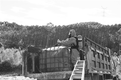 圖為當?shù)丨h(huán)保局工作人員在賀州非法傾倒危險廢物案現(xiàn)場采樣。