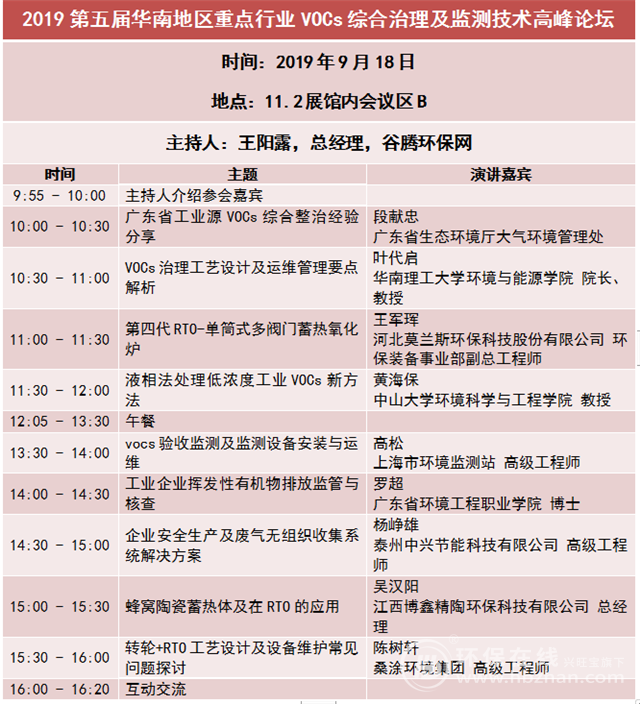 會議大氣分論壇將重點一些重點行業(yè)上,包括2019第五屆華南地區(qū)重點行業(yè)VOCs綜合治理及監(jiān)測技術高峰論壇和玻璃行業(yè)大氣污染防治升級改造技術交流會,見下表: