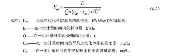 企業(yè)在一定計(jì)量時(shí)間內(nèi)處理單位化學(xué)需氧量需要消耗的用電量,耗電量?jī)H計(jì)算處理污水達(dá)到要求的排放標(biāo)準(zhǔn)時(shí)所消耗的電量,不含再生利用過程消耗的電能(同時(shí)包括辦公使用的耗電量,不包括基建、生活用耗電量等)。按公式6-3計(jì)算:
