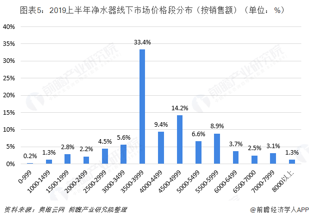 2019年上半年,在線下市場(chǎng)中,凈水器價(jià)格基本呈正態(tài)分布。3500-3999價(jià)格段市場(chǎng)占有率最高,達(dá)到33.4%;其次是4500-4999段,占比達(dá)到14.2%。