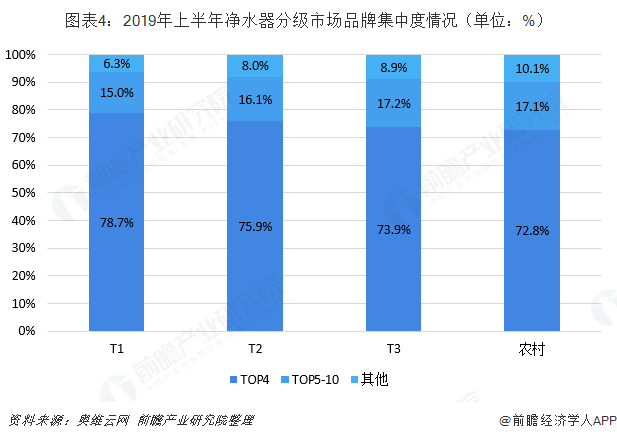2019年上半年,一級(jí)市場(chǎng)TOP4品牌集中率為78.7%,這一比例在農(nóng)村市場(chǎng)縮減至72.8%。