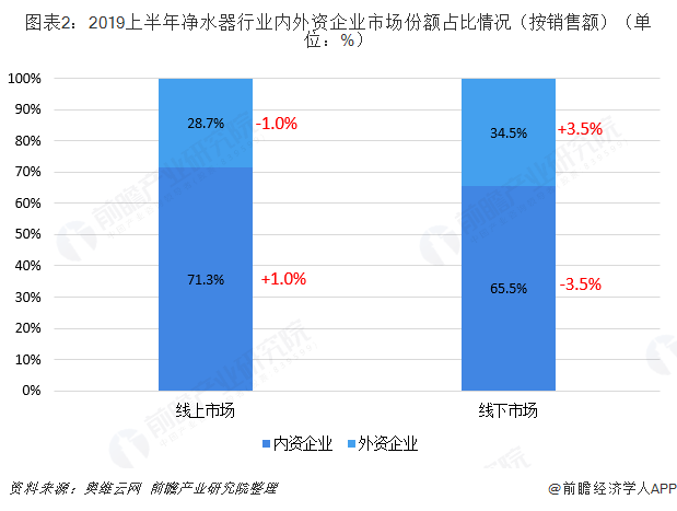 2019年上半年中國(guó)凈水器線下市場(chǎng)與2018年上半年相比新進(jìn)入行業(yè)品牌20個(gè),退出行業(yè)品牌20個(gè),凈水器線下市場(chǎng)整體品牌數(shù)量保持不變,共計(jì)105個(gè)。從銷售額的角度來(lái)看,內(nèi)資企業(yè)占據(jù)大部分市場(chǎng)份額,占比達(dá)到65.5%,同比下降3.5個(gè)百分點(diǎn);外資企業(yè)占比達(dá)到34.5%,同比增長(zhǎng)3.5個(gè)百分點(diǎn)。
