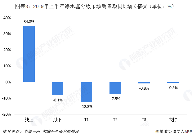 2019年上半年,凈水器線上線下市場(chǎng)分化明顯,線上市場(chǎng)繼續(xù)快速增長(zhǎng),線下市場(chǎng)開(kāi)始萎縮。2019年上半年,一二級(jí)市場(chǎng)成為主要萎縮市場(chǎng),三級(jí)市場(chǎng)及農(nóng)村市場(chǎng)微降,渠道下稱對(duì)于線下市場(chǎng)的拉動(dòng)效應(yīng)不明顯。