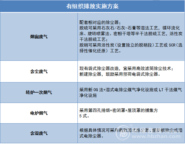 在選取技術(shù)上,《實施指南》對煙囪廢氣、含塵廢氣、轉(zhuǎn)爐一次煙氣、電爐煙氣和含濕廢氣等提供了相對應(yīng)的配套設(shè)施建議等,該采取怎樣的工藝方式等也進(jìn)行了詳細(xì)的說明。具體如下表: