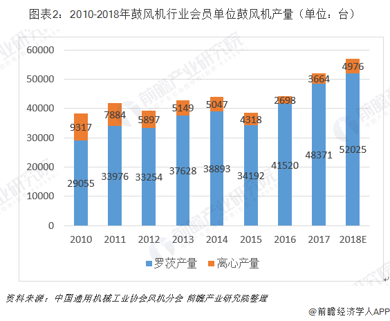 根據(jù)中國通用機械工業(yè)協(xié)會風機分會統(tǒng)計,2017年,協(xié)會會員單位羅茨鼓風機產(chǎn)量為48371臺,同比增長16.5%;協(xié)會會員單位離心鼓風機產(chǎn)量為3664臺,同比增長35.8%。據(jù)測算,2018年,協(xié)會會員單位鼓風機產(chǎn)量合計達到5.7萬臺,同比增長9.54%。