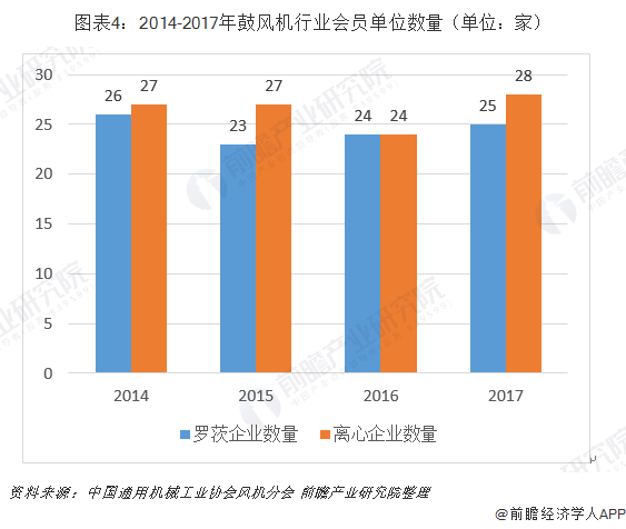 根據(jù)中國通用機械工業(yè)協(xié)會風機分會統(tǒng)計,截至2017年底,協(xié)會會員單位生產(chǎn)離心鼓風機的企業(yè)有28家,比上年增加4家;生產(chǎn)羅茨鼓風機的企業(yè)有25家。