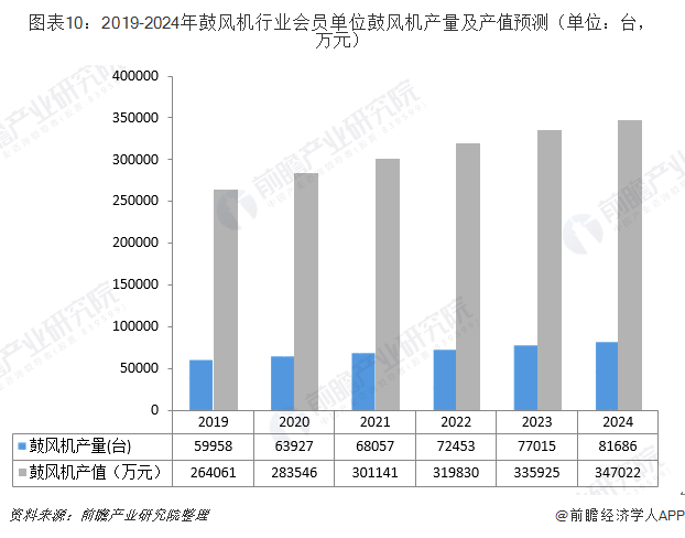 未來,國內(nèi)分布式能源、垃圾發(fā)電、污水處理、大氣污染治理行業(yè)的持續(xù)推進,將進一步刺激鼓風機行業(yè)的需求。同時競爭態(tài)勢看,國內(nèi)鼓風機企業(yè)與國外優(yōu)秀鼓風機品牌在技術(shù)上的差距在逐漸縮小,未來國內(nèi)鼓風機企業(yè)將進一步占據(jù)國內(nèi)鼓風機市場份額?;谝陨蟽牲c考量,前瞻認為,鼓風機市場仍有較大的發(fā)展空間,預計到2024年,會員單位鼓風機產(chǎn)量將突破8萬臺,會員單位鼓風機產(chǎn)值將突破34億元。