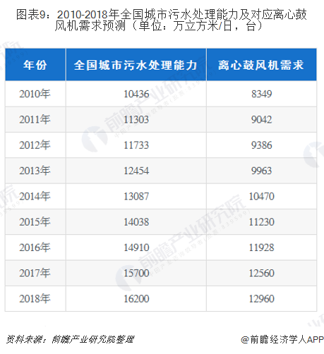 根據(jù)歷年數(shù)據(jù)和規(guī)劃進行測算,2018年城市污水處理廠數(shù)量會略有提升,達到2300個左右,污水廠日處理能力達到1.62億立方米/日,按照日處理能力50000噸配比4臺高壓離心鼓風機的比例,2018年我國城市污水處理所需高壓離心鼓風機數(shù)量為12960臺。