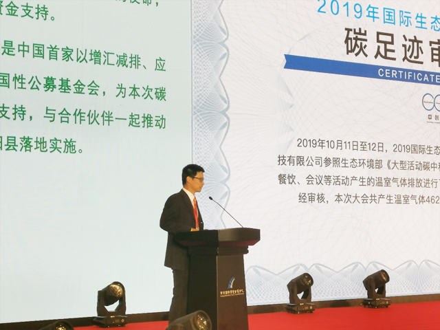在生態(tài)環(huán)境部莊國泰副部長、江蘇省人民政府郭元強副省長等領導及嘉賓的見證下,北京中創(chuàng)碳投科技有限公司副總經理錢國強先生宣讀了大會溫室氣體排放量并出具審核證書。江蘇省生態(tài)環(huán)境廳應對氣候與國際合作處王華處長為中創(chuàng)碳投頒發(fā)了碳中和紀念證書。
