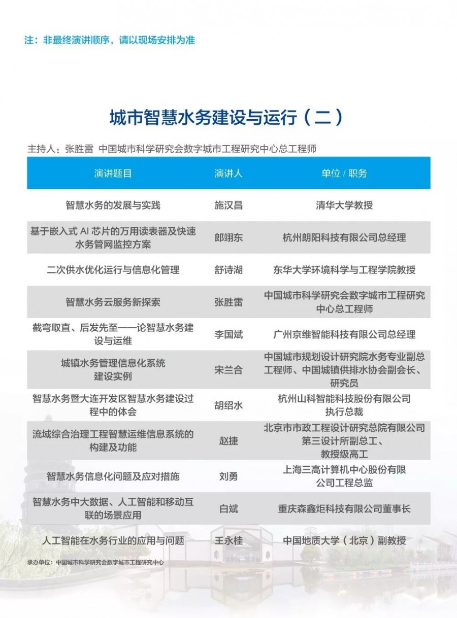 本次大會以推動我國水資源的可持續(xù)利用、水行業(yè)的健康發(fā)展以及水生態(tài)文明的貫徹落實為使命,依托廣博深厚的學(xué)術(shù)網(wǎng)絡(luò),已邀請到多位國內(nèi)外院士、國家相關(guān)部委領(lǐng)導(dǎo)、國際組織首席科學(xué)家、水環(huán)境治理和城鎮(zhèn)水務(wù)領(lǐng)域頂尖研究院所專家和領(lǐng)先企業(yè)負(fù)責(zé)人就當(dāng)前國家政策、 經(jīng)濟(jì)形勢、技術(shù)創(chuàng)新、產(chǎn)品提升、運(yùn)營管理、智慧平臺建設(shè)、大數(shù)據(jù)分析等城鎮(zhèn)水務(wù)與水環(huán)境治理前沿話題進(jìn)行學(xué)術(shù)探討交流。