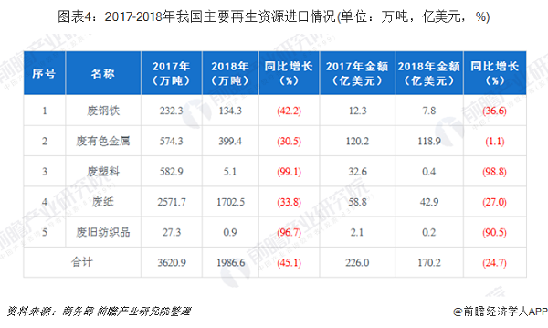 2018年,我國(guó)廢鋼鐵、廢有色金屬、廢塑料、廢紙、廢舊紡織品五大類別的再生資源進(jìn)口總量1986.6萬噸,同比下降45.1%。受到相關(guān)進(jìn)口政策調(diào)整的影響,五大類別的再生資源進(jìn)口量均出現(xiàn)下滑,其中降幅最大的是廢塑料,同比下降99.1%。