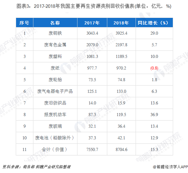 2018年,我國(guó)十大品種再生資源回收總值為8704.6億元,同比增長(zhǎng)15.3%,除廢紙回收價(jià)值有所下降外,其余再生資源品種回收價(jià)值均有增長(zhǎng)。其中,報(bào)廢機(jī)動(dòng)車增幅最高,同比增長(zhǎng)36.9%;廢輪胎增幅相對(duì)最小,僅同比增長(zhǎng)1.8%。
