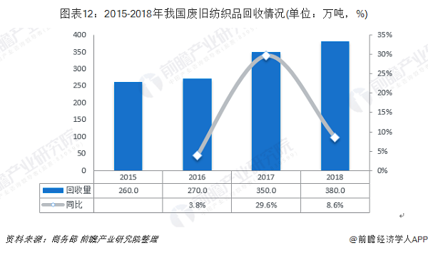 2018年,我國(guó)廢舊紡織品回收量約為380萬噸,同比增長(zhǎng)8.6%。我國(guó)舊衣物回收渠道包括回收箱、線上回收、上門回收、銷售網(wǎng)點(diǎn)代收等,已覆蓋全國(guó)大中城市。舊衣物回收企業(yè)也多管齊下,采取多種回收渠道并舉的方式。