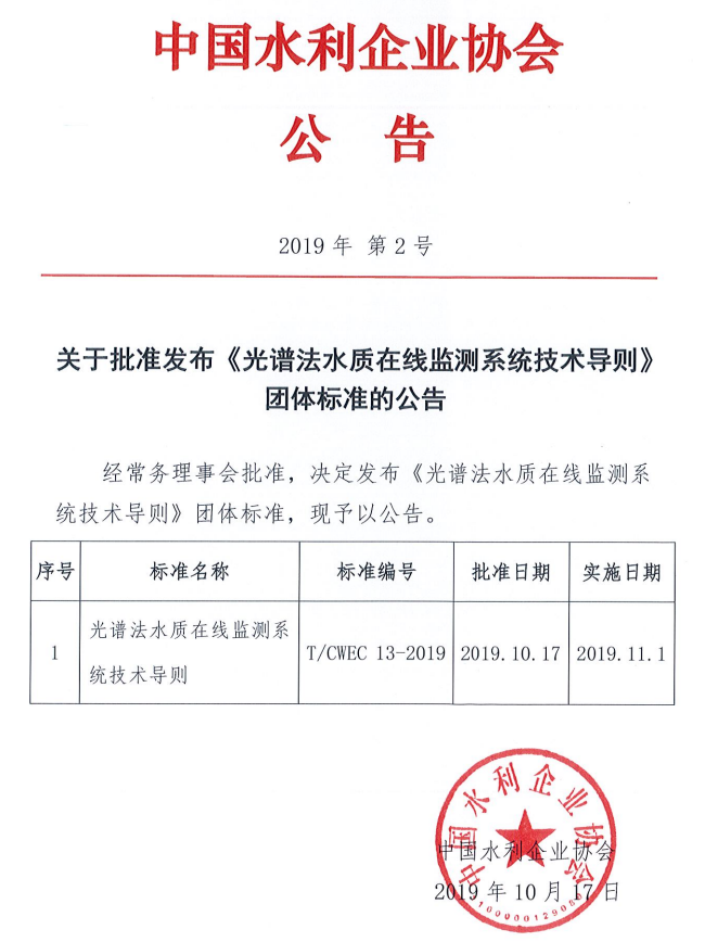 《光譜法水質(zhì)在線監(jiān)測系統(tǒng)技術(shù)導(dǎo)則》(T/CWEC 13-2019)團(tuán)體標(biāo)準(zhǔn)于2019年10月17日由中國水利企業(yè)協(xié)會(huì)發(fā)布,并于2019年11月1日實(shí)施。這是我國對光譜法水質(zhì)在線監(jiān)測技術(shù)裝備市場與行業(yè)應(yīng)用提出的第一個(gè)重要標(biāo)準(zhǔn),填補(bǔ)了我國此項(xiàng)技術(shù)市場應(yīng)用標(biāo)準(zhǔn)上的空白。