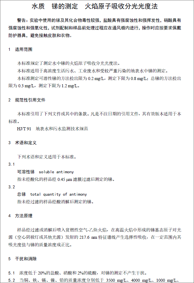 為貫徹《中華人民共和國(guó)環(huán)境保護(hù)法》和《中華人民共和國(guó)水污染防治法》,保護(hù)生態(tài) 環(huán)境,保障人體健康,規(guī)范水中銻的測(cè)定方法,制定本標(biāo)準(zhǔn)。本標(biāo)準(zhǔn)規(guī)定了測(cè)定高濃度生活污水、工業(yè)廢水和受較嚴(yán)重污染的地表水中銻的火焰原子吸收分光光度法。本標(biāo)準(zhǔn)的附錄A和附錄B為規(guī)范性附錄,附錄C為資料性附錄。本標(biāo)準(zhǔn)為首次發(fā)布。