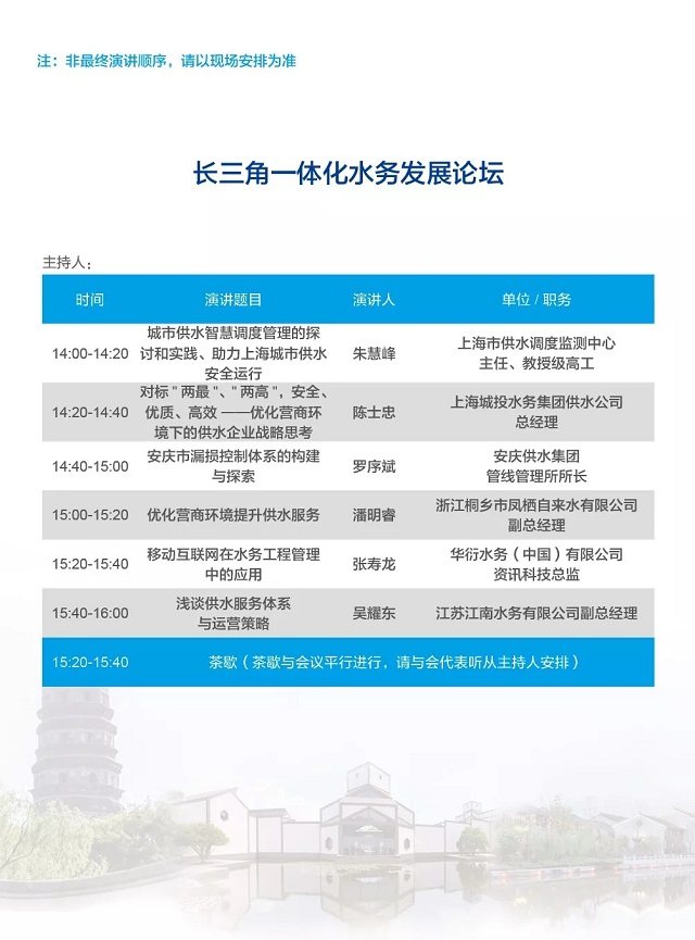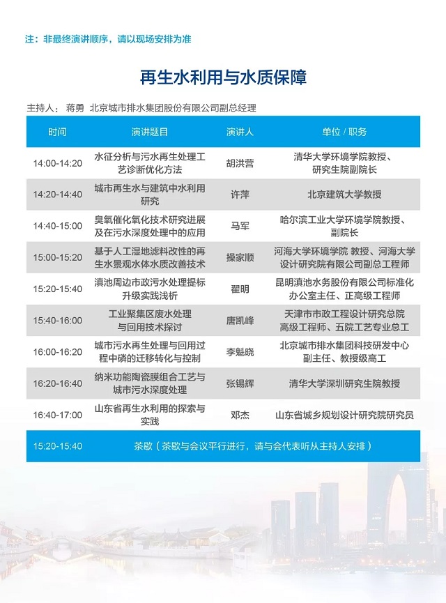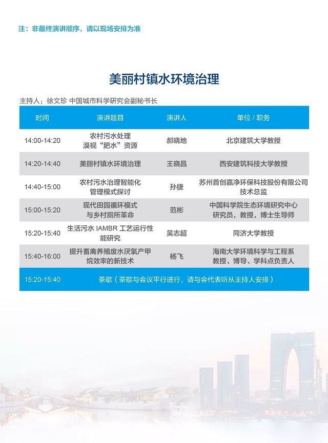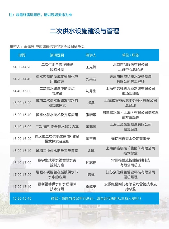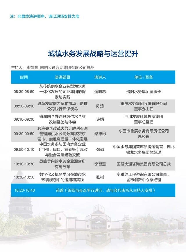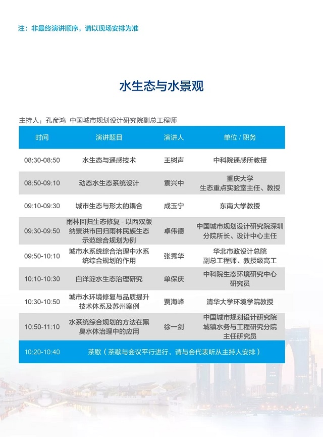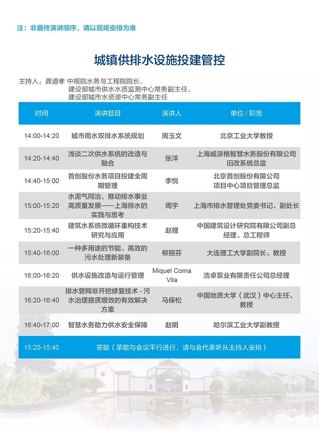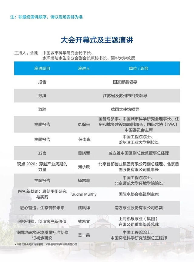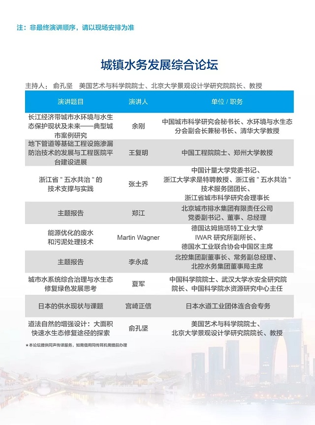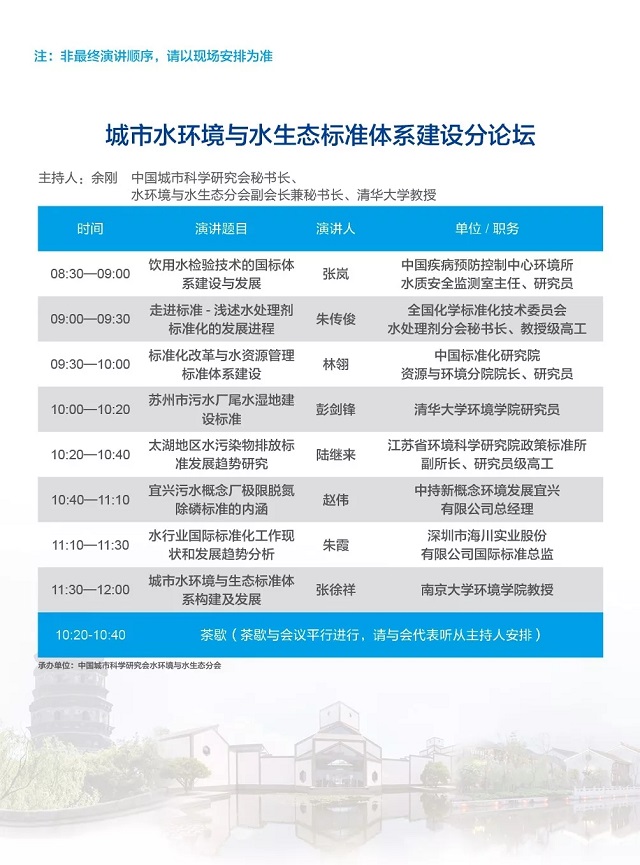 除以上分論壇外,蘇州論壇——高品質(zhì)水公共產(chǎn)品研討會、建筑節(jié)水論壇、城鎮(zhèn)水環(huán)境綜合整治與管理、中-法水務(wù)科技論壇等論壇議程正在確認中……敬請期待!