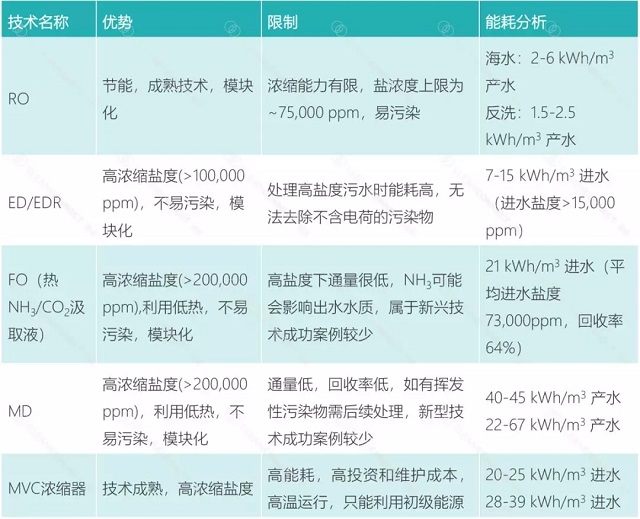 早期ZLD系統(tǒng)鹽水濃縮主要采用熱濃縮技術(shù),機(jī)械式蒸汽壓縮技術(shù)(MVC)及目前應(yīng)用較多的機(jī)械式蒸汽再壓縮技術(shù)(MVR)。MVC技術(shù)的應(yīng)用已經(jīng)有幾十年的歷史,不斷發(fā)展熱回收裝置,但能耗高且需要高品質(zhì)電能仍是該技術(shù)推廣應(yīng)用最大的限制。通常來說,每處理1噸進(jìn)水,則消耗20-25 kWh的電能,這已經(jīng)成為其他ZLD濃縮技術(shù)的基準(zhǔn),是其他技術(shù)節(jié)能降耗的方向。為了降低MVC的能耗,實際工程中常將RO與MVC工藝耦合,利用RO進(jìn)行預(yù)濃縮,能夠大大降低能耗,兩者協(xié)同作用以實現(xiàn)高鹽廢水零排放。RO的加入可節(jié)省58−75%的能源及48−67%的運行成本。然而,將RO應(yīng)用于零排放,有兩個比較大的限制,膜結(jié)垢/膜污染和濃縮能力較低。新型膜濃縮技術(shù)包括膜蒸餾技術(shù)、正滲透技術(shù)、電滲析技術(shù)等,作為RO濃水進(jìn)一步濃縮工藝,出水則進(jìn)入結(jié)晶過程。各種膜濃縮技術(shù)的優(yōu)勢、限制及能耗分析如下表所示。
