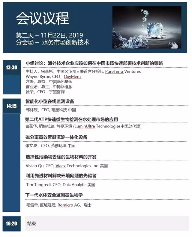今年的水論壇由來自中國和歐洲的影響力水投資基金PureTerra Ventures將以主旨演講“加速水處理解決方案來應(yīng)對中國水務(wù)市場的挑戰(zhàn)”作為開場。同時水論壇還將以海外技術(shù)企業(yè)在中國市場快速部署技術(shù)創(chuàng)新的策略為主題,進(jìn)行一場互動式專題討論會。
