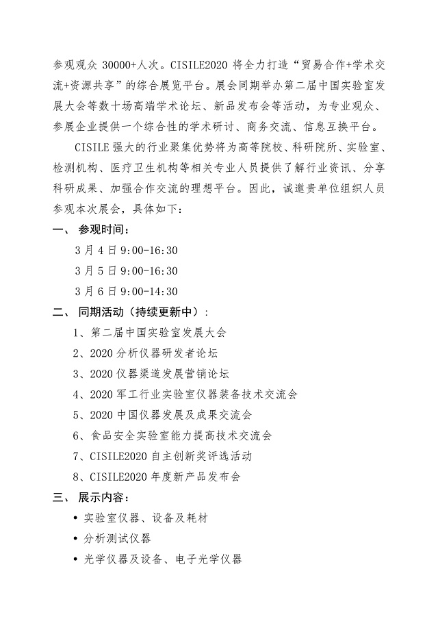 第十八屆中國(guó)國(guó)際科學(xué)儀器及實(shí)驗(yàn)室裝備展覽會(huì)(CISILE2020)將于2020年3月4-6日在北京·國(guó)家會(huì)議中心召開,預(yù)計(jì)展示面積25000平方米,參展企業(yè)700余家,參觀人次30000人次,同期將舉辦多元化的論壇及互動(dòng)活動(dòng),為廣大科研人員及行業(yè)人士便捷地獲取行業(yè)新資訊、分享前沿技術(shù)和研究成果、交流研討產(chǎn)業(yè)政策搭建交流的平臺(tái)。