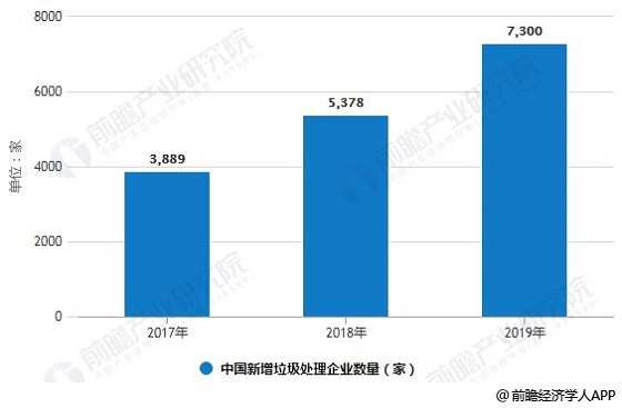 近年來(lái),垃圾處理企業(yè)年增量逐年攀升:2017年、2018年中國(guó)新增垃圾處理企業(yè)分別為3889家和5378家,而截至11月18日,2019年新增該類(lèi)企業(yè)已超過(guò)7300家,占總量的26.49%,平均每天就有約23家新企業(yè)出現(xiàn)。