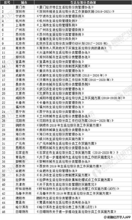 中國(guó)46個(gè)重點(diǎn)城市垃圾分類(lèi)名單匯總情況