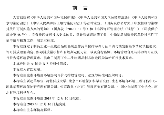 為貫徹落實《中華人民共和國環(huán)境保護法》《中華人民共和國大氣污染防治法》《中華人民共和國水污染防治法》《中華人民共和國土壤污染防治法》等法律法規(guī)、《國務院辦公廳關于印發(fā)控制污染物排放許可制實施方案的通知》(國辦發(fā)〔2016〕81號)和《排污許可管理辦法(試行)》(環(huán)境保護部令第48號),完善排污許可技術支撐體系,指導和規(guī)范制藥工業(yè)—生物制品制造排污單位排污許可證申請與核發(fā)工作,制定本標準。