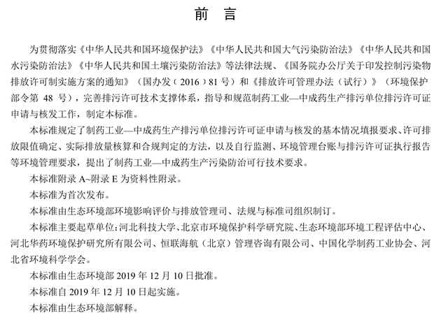 貫徹落實《中華人民共和國環(huán)境保護法》《中華人民共和國大氣污染防治法》《中華人民共和國水污染防治法》《中華人民共和國土壤污染防治法》等法律法規(guī)、《國務(wù)院辦公廳關(guān)于印發(fā)控制污染物排放許可制實施方案的通知》(國辦發(fā)﹝2016﹞81號)和《排放許可管理辦法(試行)》(環(huán)境保護部令第 48 號),完善排污許可技術(shù)支撐體系,指導(dǎo)和規(guī)范制藥工業(yè)—中成藥生產(chǎn)排污單位排污許可證申請與核發(fā)工作,制定本標準。