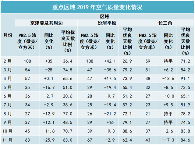 從上表我們也可以看出,這一年來,三大重點區(qū)域的PM2.5濃度處于下降趨勢,同時也會發(fā)現,大氣污染治理的區(qū)域性和季節(jié)性明顯,這意味著,雖然在治理PM2.5上取得了不錯的成績,但治理情況不穩(wěn)定,距離形成常態(tài)化的空氣質量改善目標仍有差距。