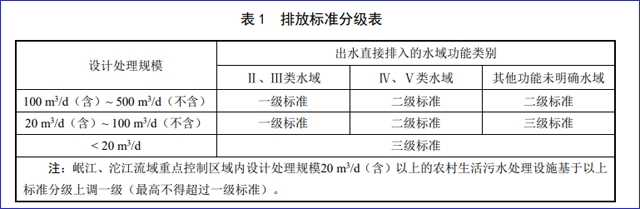 根據(jù)污水處理設(shè)施出水直接排入的水域功能類別和設(shè)計處理規(guī)模,將農(nóng)村生活污水處理設(shè)施水 污染物排放標準劃分為一級標準、二級標準和三級標準,各級標準的適用情況見表1。其中,岷江、沱江流域重點控制區(qū)域內(nèi)(參見文末附件),設(shè)計處理規(guī)模20m³/d(含)以上的農(nóng)村生活污水處理設(shè)施對應(yīng)表1所列標準上調(diào)一級(最高不得超過一級標準)。