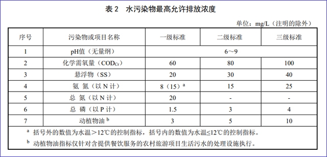 農(nóng)村生活污水經(jīng)處理后的水污染物,其最高允許排放濃度按表2規(guī)定執(zhí)行。尤為值得關(guān)注的是,《標準》對化學(xué)需氧量、氨氮等易致黑臭的耗氧性指標加嚴控制,對實際運行中確難去除的總氮、總磷適當放寬要求。