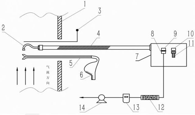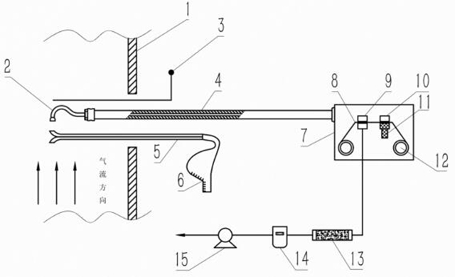 1-煙道壁;2-采樣嘴;3-溫度測量;4-采樣管;5-皮托管;6-壓力計;