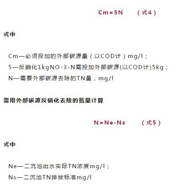 在硝化反硝化系統(tǒng)中,因內(nèi)回流攜帶DO的影響,實際中投加碳源的量并和理論值相差很大,運(yùn)營中往往是按照經(jīng)驗公式來計算的,簡單方便快捷,脫氮系統(tǒng)的CN比的經(jīng)驗值一般控制在4~6,很多時間會采用中間值計算或者通過對化驗出水TN來調(diào)整投加量!