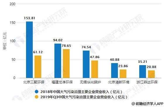 2018-2019年Q3中國大氣污染治理主要企業(yè)營業(yè)收入統(tǒng)計情況