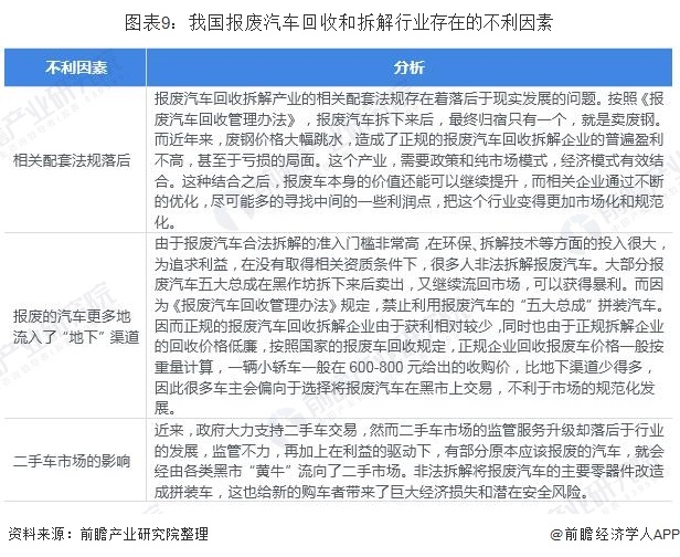 雖然,我國報廢汽車回收和拆解行業(yè)近年來取得了較大的進展,但整體來說行業(yè)發(fā)展仍處于初級階段,存在諸多不利因素: