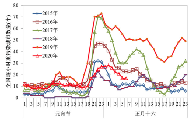 圖3近六年元宵節(jié)期間全國(guó)逐小時(shí)重污染城市數(shù)量
