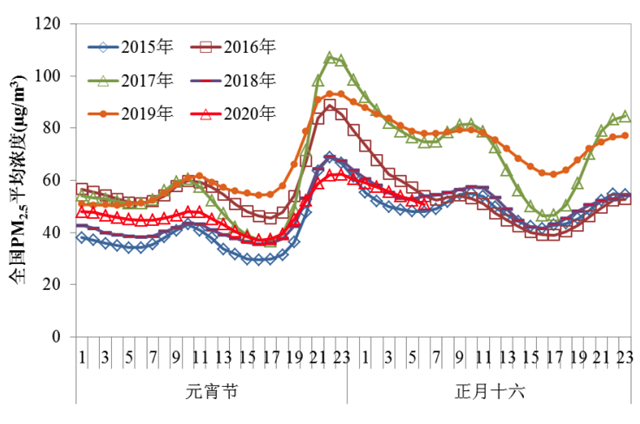 圖2近六年元宵節(jié)期間全國(guó)逐小時(shí)PM2.5平均濃度