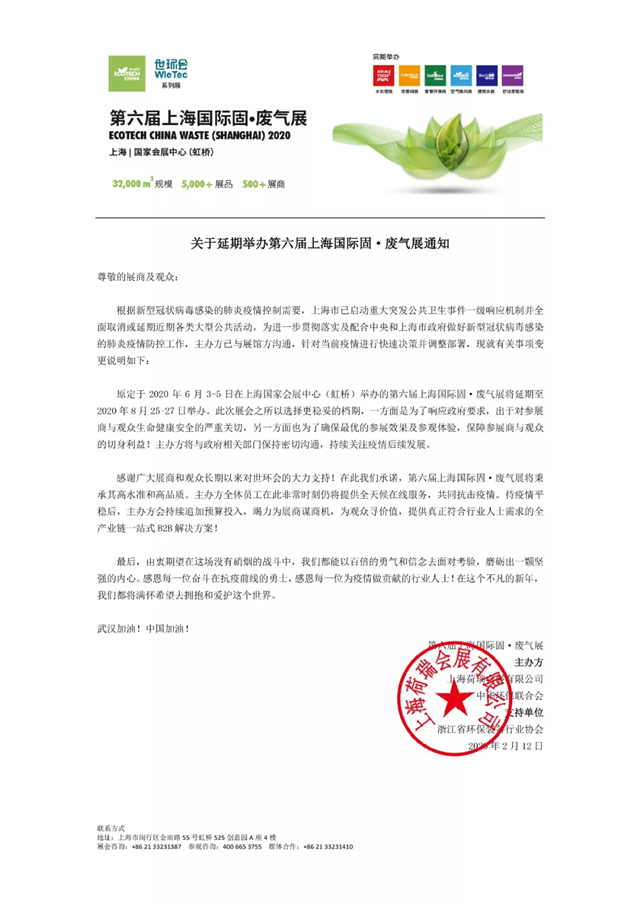 為避免人員聚集引發(fā)交叉感染,較大限度降低人群集聚可能造成的疫情傳播風險,保障所有展商、觀眾及參會人員的安全和健康,主辦方?jīng)Q定,將原定于2020年6月3-5日在上海國家會展中心(虹橋)舉辦的第六屆上海國際固●廢氣展將延期至2020年8月25-27日舉辦。