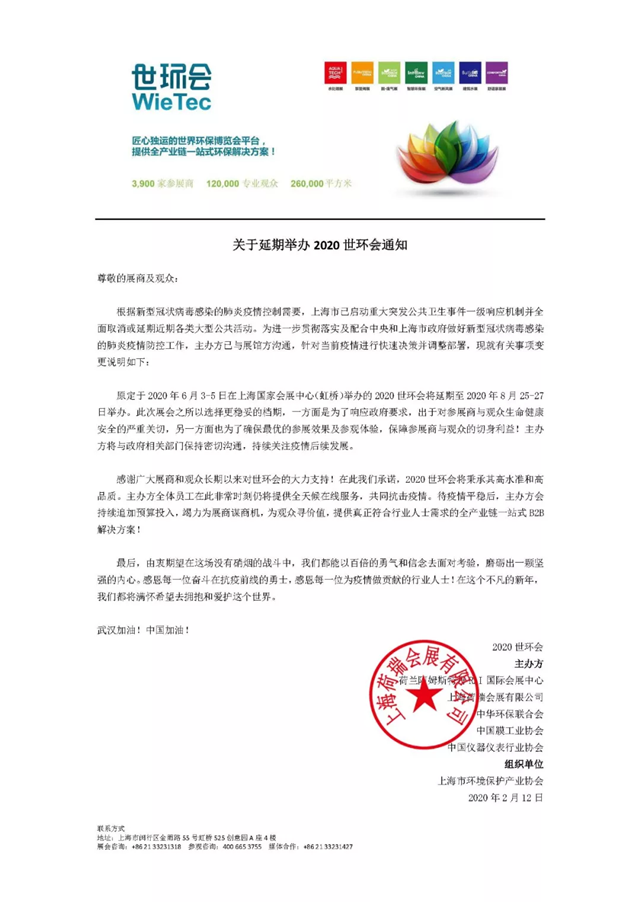 為進一步貫徹落實及配合中央和上海市政府做好新型冠狀病毒感染的肺炎疫情防控工作,切實保障參展商與觀眾生命健康安全及切身利益,確保參展效果及參觀體驗,主辦方響應政府號召,在春節(jié)期間已與展館方溝通,針對當前疫情進行快速決策及調(diào)整部署,選擇更穩(wěn)妥的檔期,將原定于2020年6月3-5日在上海國家會展中心(虹橋)舉辦的2020世環(huán)會延期至2020年8月25-27日舉辦。