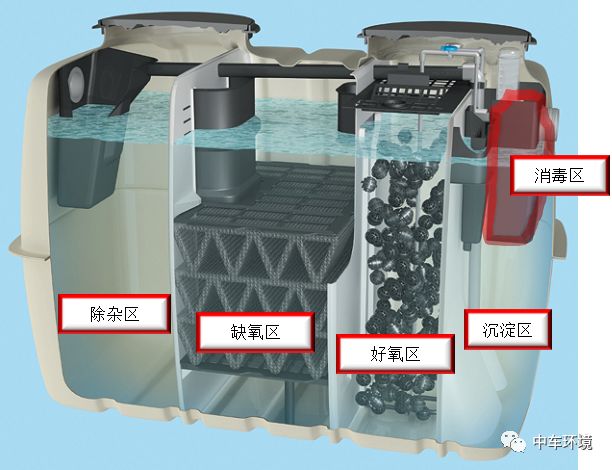 中國中車的農(nóng)村污水處理成套裝備已集成了消毒藥劑的儲存、投加與混合功能,操作方便,可迅速投入使用。例如,圖1-2為中國中車某型凈化槽及其消毒功能的使用方法。其采用緩釋氯片作為消毒劑,使用時(shí)將氯片放入藥劑筒,通過旋轉(zhuǎn)調(diào)節(jié)藥劑筒底部的開口即可調(diào)節(jié)消毒劑的溶解量。