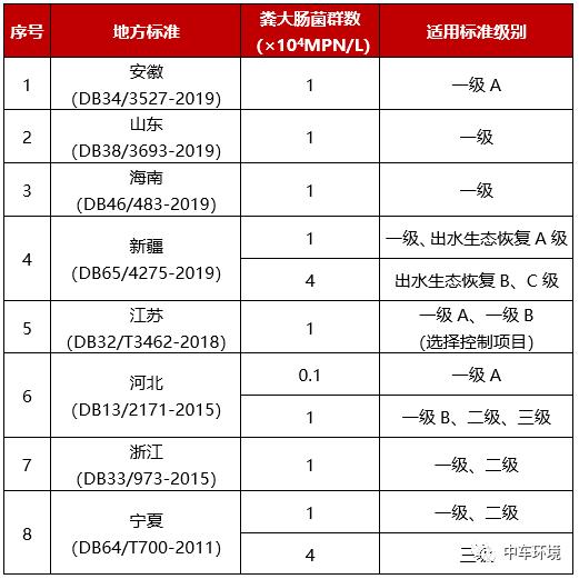 農(nóng)村污水處理設(shè)施尾水一般就近進(jìn)入村莊周邊河道坑塘,或用于農(nóng)田灌溉等回用用途。據(jù)不完全統(tǒng)計(jì),在已發(fā)布的31個(gè)省/直轄市的地方農(nóng)村污水處理設(shè)施水污染物排放標(biāo)準(zhǔn)中,僅有8個(gè)地區(qū)的農(nóng)污標(biāo)準(zhǔn)對出水的衛(wèi)生學(xué)指標(biāo)提出了要求(以糞大腸桿菌群為主,見表1)。在大部分地區(qū)農(nóng)污標(biāo)準(zhǔn)中,除出水回用時(shí)需達(dá)到相應(yīng)的回用標(biāo)準(zhǔn)外(如灌溉),并未對出水的衛(wèi)生學(xué)指標(biāo)作出單獨(dú)規(guī)定。