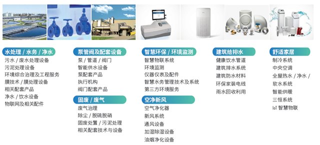 工業(yè)膜主題展區(qū)、水務(wù)工程主題展區(qū)、環(huán)境綜合治理主題展區(qū)、城鎮(zhèn)水務(wù)及智慧水務(wù)主題展區(qū)、村鎮(zhèn)污水綜合治理主題展區(qū)、管道系統(tǒng)主題展區(qū)、海綿城市主題展區(qū)、排水系統(tǒng)主題展區(qū)、市政工業(yè)管道管材主題展區(qū)、化工流體環(huán)保主題展區(qū)、泵閥零配件主題展區(qū)、智慧供水技術(shù)設(shè)備主題展區(qū)、智慧環(huán)保 / 環(huán)境監(jiān)測(cè)主題展區(qū)、固廢處置 / 污泥治理主題展區(qū)、廢氣治理主題展區(qū)、除塵 & 脫硫脫硝主題展區(qū)、廢水零排放主題展區(qū)、垃圾滲濾液處理主題展區(qū)、電機(jī)節(jié)能專區(qū)。