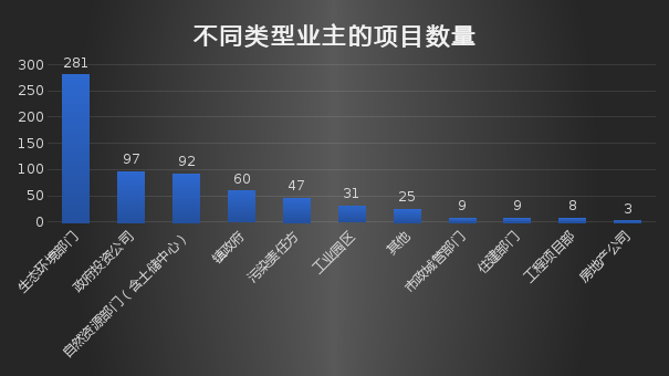 (2)政府投資公司,產(chǎn)生了第二多的項(xiàng)目,業(yè)務(wù)模式大多是作為政府融資平臺(tái)牽頭進(jìn)行地塊開發(fā),土地流轉(zhuǎn)資金支持修復(fù)工作。