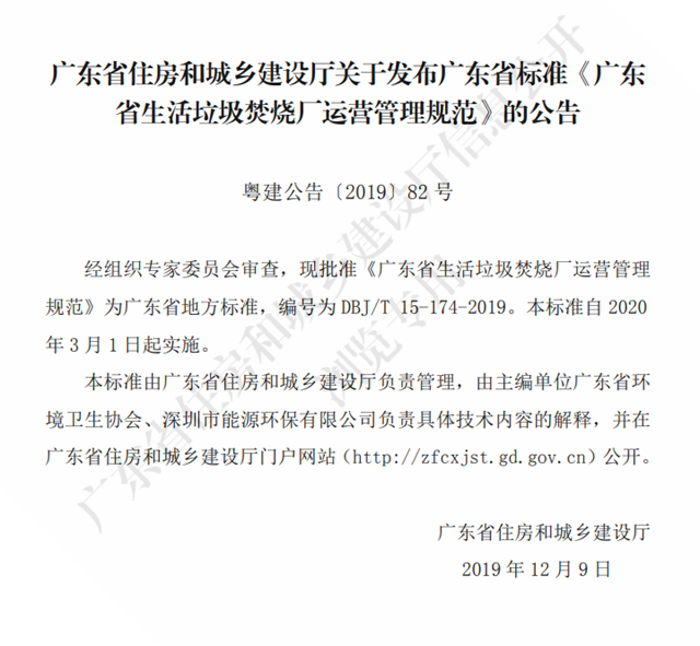 廣東省住房和城鄉(xiāng)建設(shè)廳關(guān)于發(fā)布廣東省標(biāo)準(zhǔn)《廣東省生活垃圾焚燒廠運(yùn)營管理規(guī)范》的公告