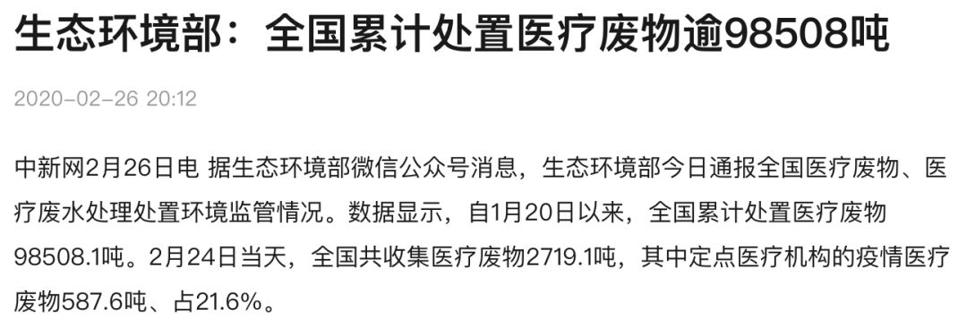 據(jù)生態(tài)環(huán)境部微信公眾號(hào)消息,自1月20日以來,全國(guó)累計(jì)處置醫(yī)療廢物已經(jīng)超過了98508噸。