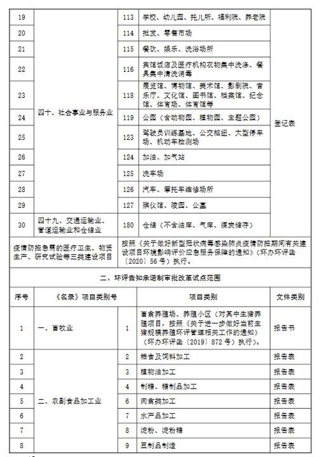 豁免部分項(xiàng)目環(huán)評(píng)手續(xù)辦理。繼續(xù)落實(shí)好已出臺(tái)的新冠肺炎疫情防控期間急需的醫(yī)療衛(wèi)生、物資生產(chǎn)、研究試驗(yàn)等三類建設(shè)項(xiàng)目環(huán)評(píng)應(yīng)急服務(wù)保障政策。加強(qiáng)與排污許可制銜接,對(duì)照《建設(shè)項(xiàng)目環(huán)境影響評(píng)價(jià)分類管理名錄》(以下簡稱《名錄》),對(duì)關(guān)系民生且納入《固定污染源排污許可分類管理名錄(2019年版)》實(shí)施排污許可登記管理的相關(guān)行業(yè),以及社會(huì)事業(yè)與服務(wù)業(yè),不涉及有毒、有害及危險(xiǎn)品的倉儲(chǔ)、物流配送業(yè)等10大類30小類行業(yè)的項(xiàng)目,不再填報(bào)環(huán)境影響登記表。