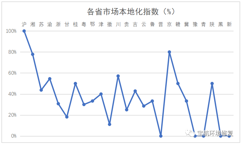除了污染特征、地方財力等因素外,市場環(huán)境也是我們關(guān)注的重點,為此我們提出了一個簡單的“市場本地化指數(shù)”,即省外企業(yè)中標項目數(shù)量在該省份全部項目中所占的比例。
