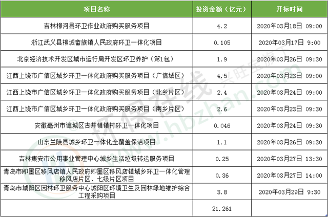 環(huán)保在線關(guān)注環(huán)衛(wèi)市場動態(tài)時(shí)發(fā)現(xiàn),短短幾天時(shí)間,招標(biāo)市場就聚集了多個(gè)環(huán)衛(wèi)相關(guān)標(biāo)的,項(xiàng)目總投資額高達(dá)21億元。