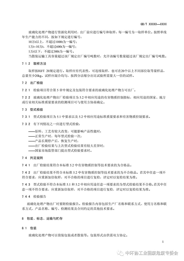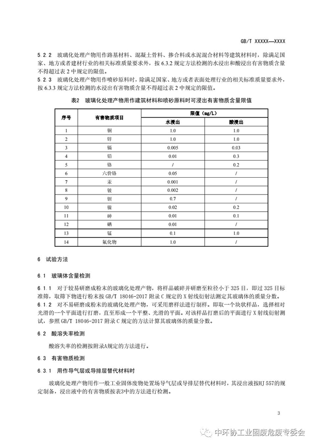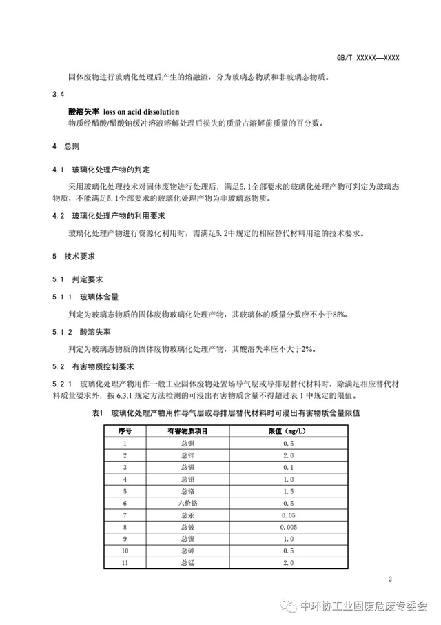 為對固體廢物玻璃化處理產(chǎn)物進(jìn)行技術(shù)界定,加強(qiáng)對固廢玻璃化處理產(chǎn)物的風(fēng)險控制,根據(jù)國家標(biāo)準(zhǔn)化管理委員會標(biāo)準(zhǔn)制修訂計劃,本技術(shù)委員會組織開展了國家標(biāo)準(zhǔn)《固體廢物玻璃化處理產(chǎn)物技術(shù)要求》(計劃編號:20171153-T-469)研制工作。本標(biāo)準(zhǔn)項目由全國危險廢物處理處置和利用標(biāo)準(zhǔn)工作組相關(guān)單位負(fù)責(zé)研制,目前已經(jīng)完成標(biāo)準(zhǔn)征求意見稿?,F(xiàn)就該標(biāo)準(zhǔn)公開征求意見,請組織相關(guān)人員研究提出書面反饋意見,并于2020年5月10日前填寫意見反饋表,反饋至秘書處(word版文件以及蓋章后的pdf掃描件請同時發(fā)送至:fangfei@cnis.ac.cn)。