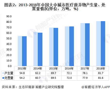 隨著城市化進程加快,我國大中城市醫(yī)療廢棄物產(chǎn)生量與處置量呈逐年上漲態(tài)勢。2018年,我國大中城市醫(yī)廢產(chǎn)生量達81.7萬噸,同比增長4.61%;處置量達81.6萬噸,同比增長4.75%。